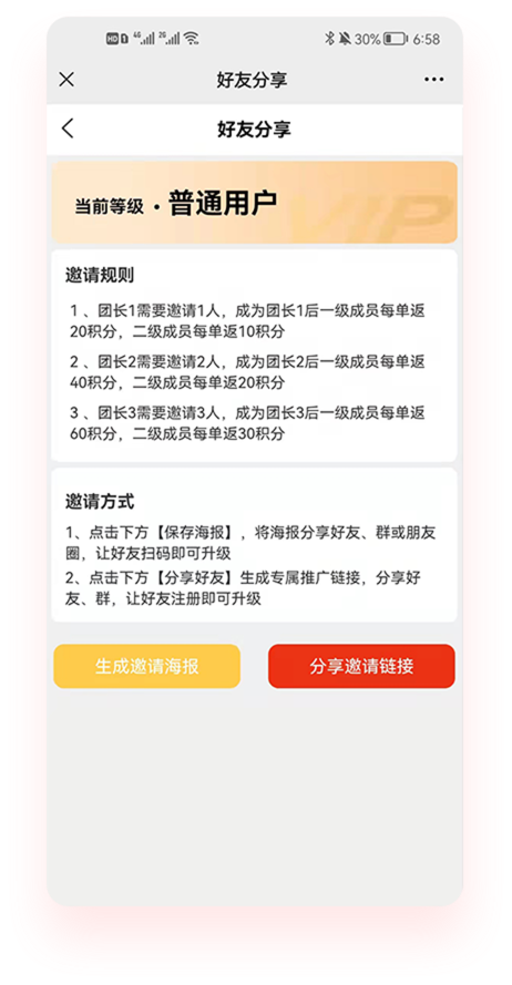 专属海报分享好友注册成为下线,还有我的团队、我的渠道等营销功能合力助推粉丝活跃度